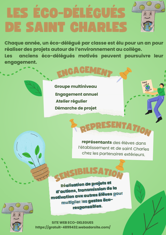 Chaque année, un éco-délégué par classe est élu pour un an pour réaliser des projets autour de l’environnement au collège. Les anciens éco-délégués motivés peuvent poursuivre leur engagement.